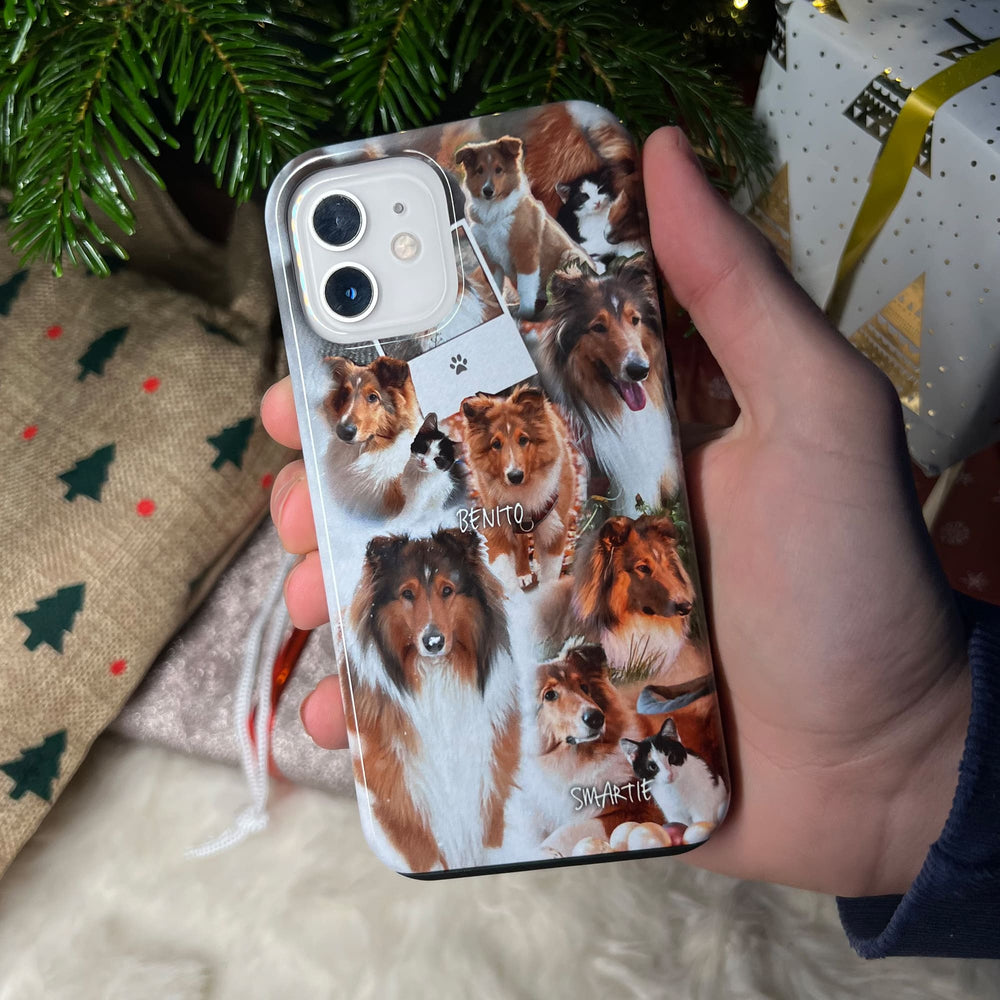 Lade 6-12 Fotos von euch hoch und unsere talentierten Designer erstellen, nach Eingang deiner Bestellung, eine einzigartige Haustier - Collage komplett nach deinen Wünschen! Das Ergebnis wird auf eine hochwertige und rundumschützende Handyhülle gedruckt. Ein persönliches Geschenk, das deine Liebe auf stilvolle Weise zum Ausdruck bringt.
